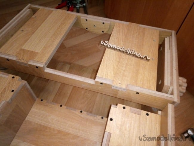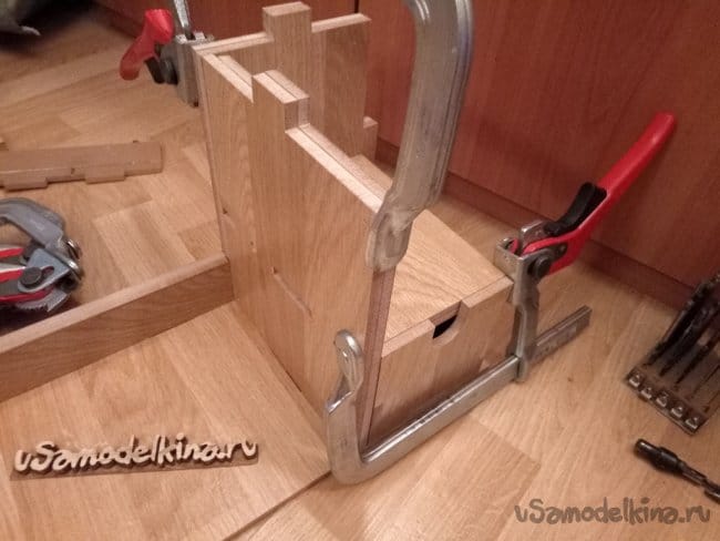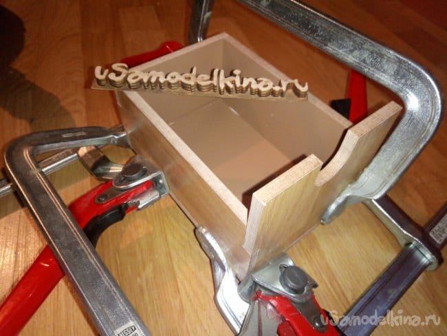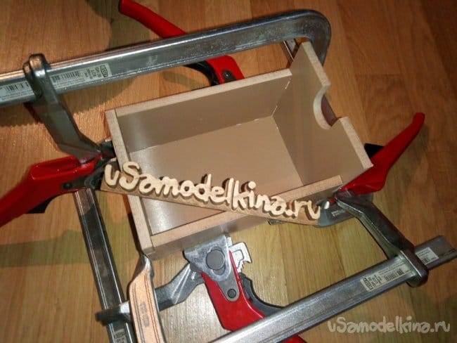 Собираю первый ящик. Он нужен будет для примерки. Что бы сразу можно было понять где и что пошло не так. Так же стыки проклеиваю и стягиваю струбцинами. Позже еще промазал тонким слоем клея все внутренние углы. Не обязательно конечно было, но мне так захотелось.