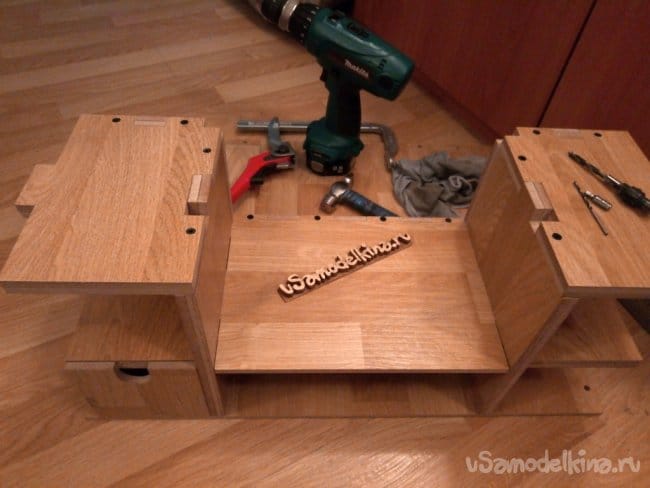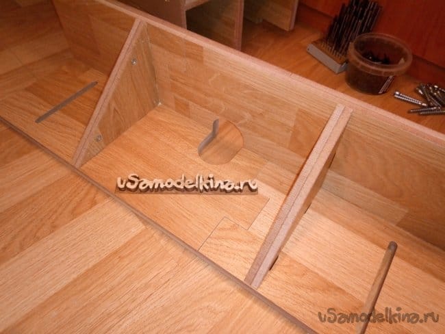 Продолжаю дальше собирать. К переборке и основанию монтирую боковые стенки с помощью клея, саморезов и мебельных винтов. На фотографиях ниже видно что я добавил еще отсек для ящика посередине. Детали этого отсека окончательно свяжут между собой боковые стенки, что придаст дополнительную жесткость столу.