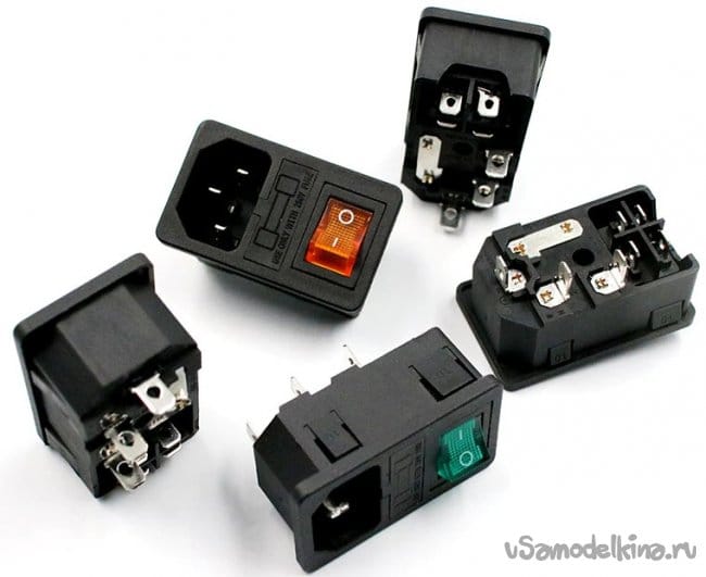 В задней стенке я заложил отверстие для разъема питающего кабеля с тумблером. Деталь с AliExpress.