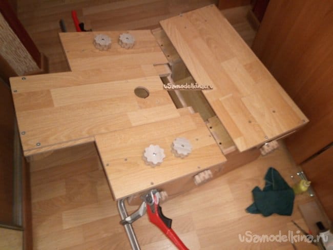 Среднюю часть, где будет установлен фрезер, я заново переклеил. По первости хотел на ПВА соединить половинки, но спустя неделю клей так и не высох. Покрытие ламината не дает клею впитываться и сохнуть. Поэтому я соединил уже на "момент".