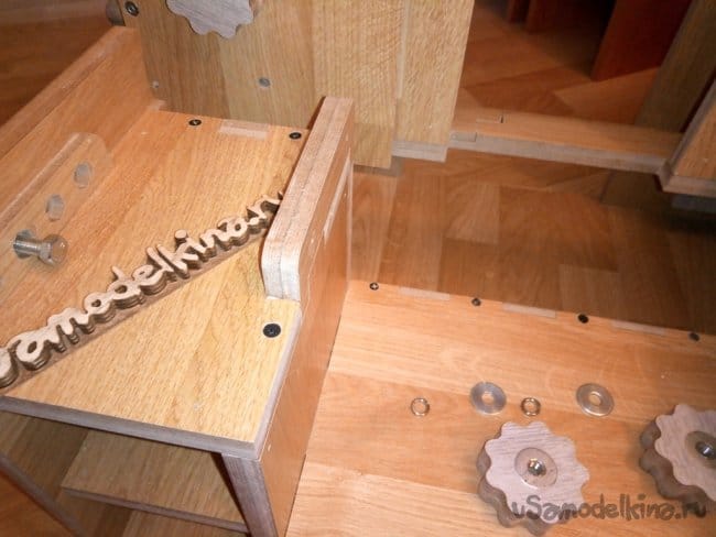 Дальше приступаю к сборке верхней крышки поворотной детали. Ее сначала выставил в правильное положение относительно поворотных боковин, забил шканты 6 мм и стянул конфирматами.