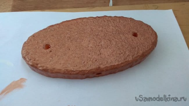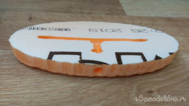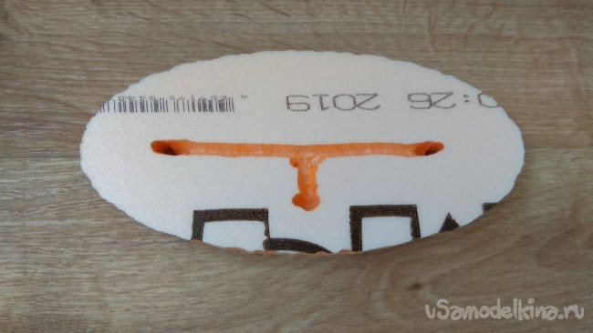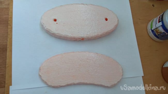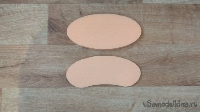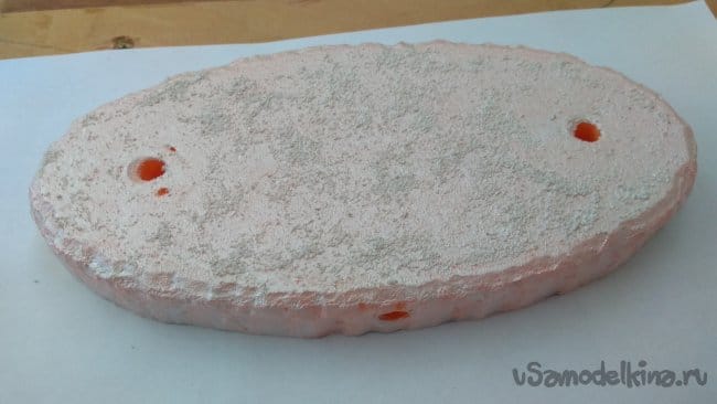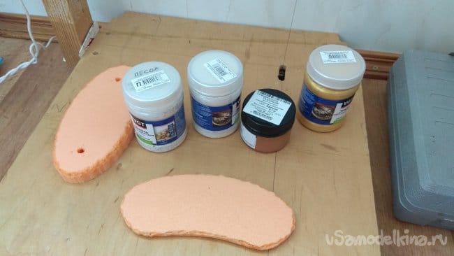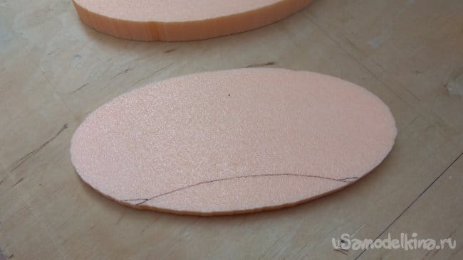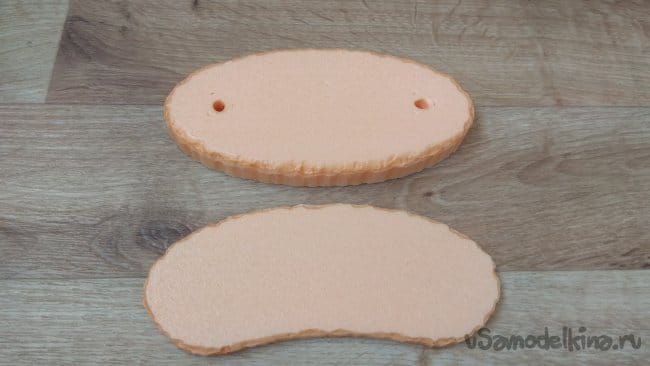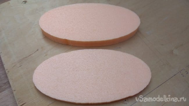 В Paint нарисовал подходящий овал, распечатал, вырезал и приклеил на заготовку из пеноплэкса. Заметил, что на шероховатую поверхность краска ложится намного лучше, чем на гладкую, поэтому у основания срезал верх, а заготовку для перемычки распустил из еще одного куска пеноплэкса. Вырезал два овала. Для лучшего обзора фигурок собачек сделал в перемычке радиусный вырез.