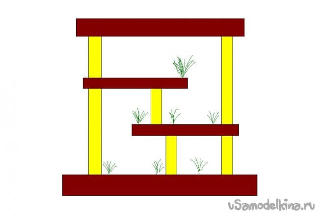 Размещать фигурки собирался на разных уровнях между декоративными кустиками. Подсветку полипропиленовых трубок, в связи с их достаточно большой длинной, планировал сделать с двух сторон, сверху и снизу. Мне представляется, должны были бы появиться интересные световые эффекты. Приступил к изготовлению основания и уровней. Прямоугольники начальной идеи показались слишком банальными, поэтому мои шаловливые руки вырезали хитрые заготовки с плавно-рваными изгибами))