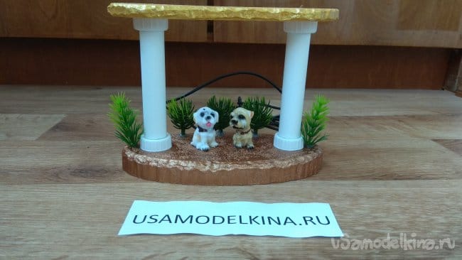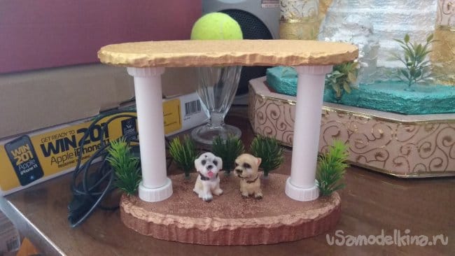 Фигурки собачек маленькие, выглядят сиротливо на большом основании. Украсил пейзаж искусственными растениями.