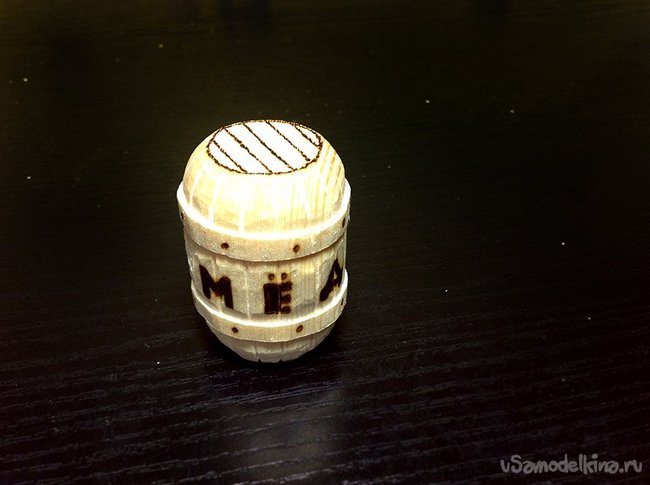 Выжигателем наносим рисунок: заклепки на обручах, крышку и дно бочки, а также надпись МЁД
