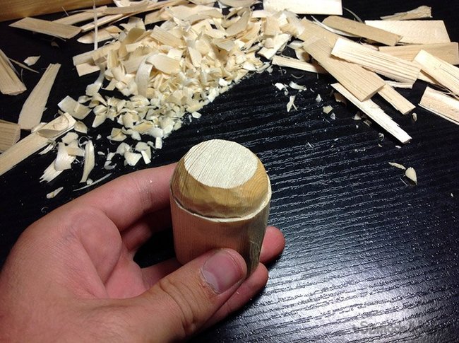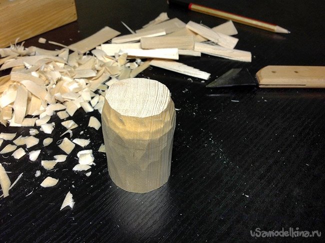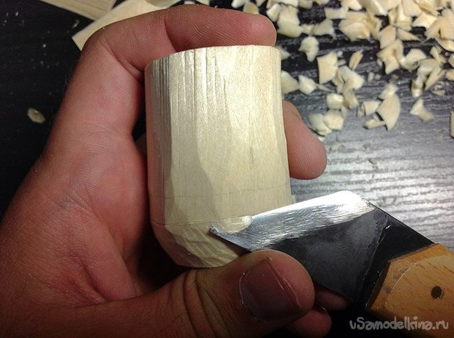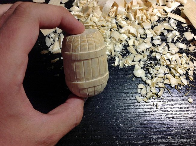 Теперь будем работать угловой стамеской. Она нужна для того, чтобы показать каждую клепку (дощечку) на бочонке.