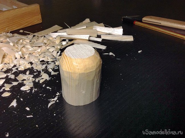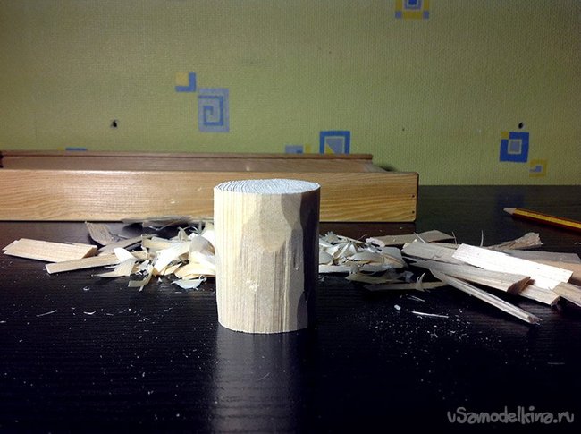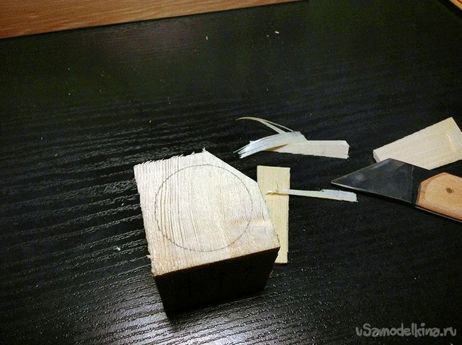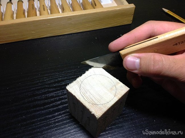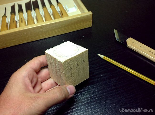 Для дальнейшей обработки заготовки нам понадобится резак по дереву. Карандашом намечаем окружность на верхней части бруска диаметром 4 см. Очень важно держать держать так, чтобы волокна шли вертикально.