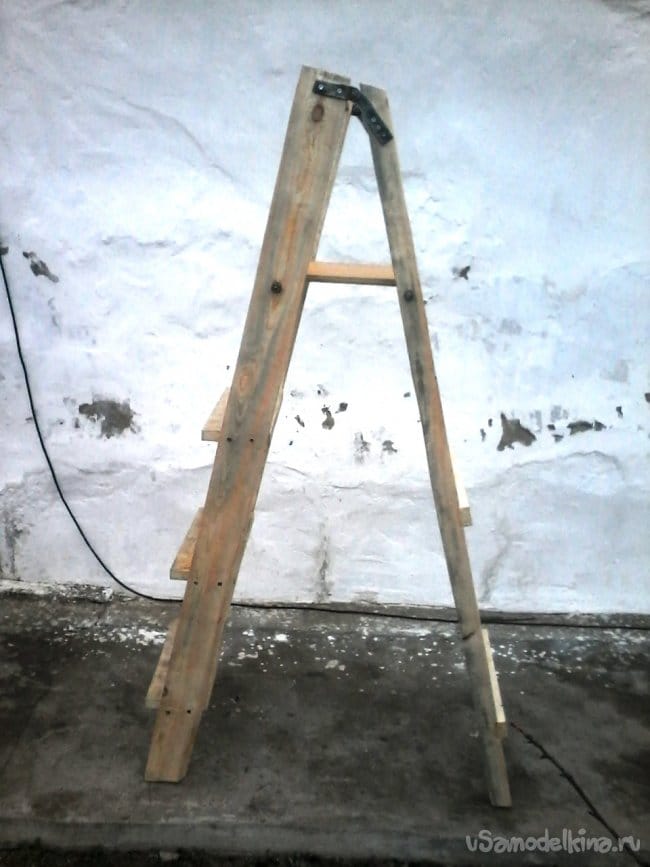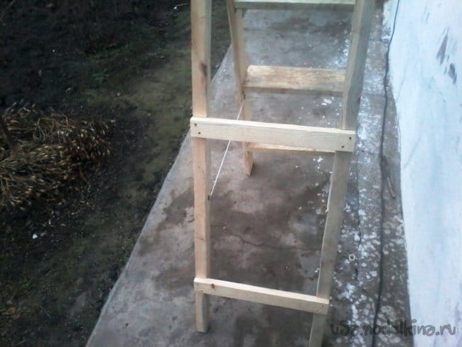Расстояние между стойками стремянки -380мм. Внизу и посередине бруски соединяем брусками 450*50*25мм при помощи саморезов.
