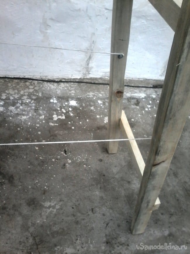 Шаг-4. Привязав к ногам стремянки капроновый шнур на высоте 50-ти см от пола, тем самым зафиксируем ее в разложенном состоянии. Отмеряем 200мм от пола чертим линию на тесинках по уровню параллельно полу. От этой линии отмечаем еще 350мм, и от нее еще 350мм. Это будут наши размеры под ступеньки стремянки. Ступеньки отрезаем от тесины размером 380*150*25мм -3 штуки. Их крепим к боковым стойкам при помощи мебельных саморезов,