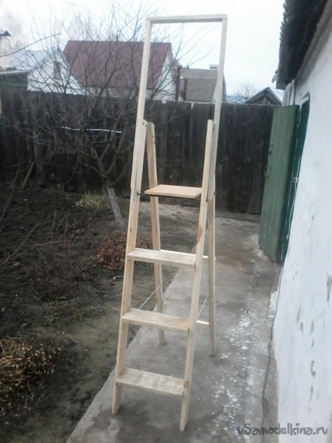 Снизу по боковым стойкам крепим капроновый шнур на высоте 500мм от пола, для того, чтобы создать устойчивость стремянке. Хотя уже верхняя площадка устойчиво фиксирует стремянку.