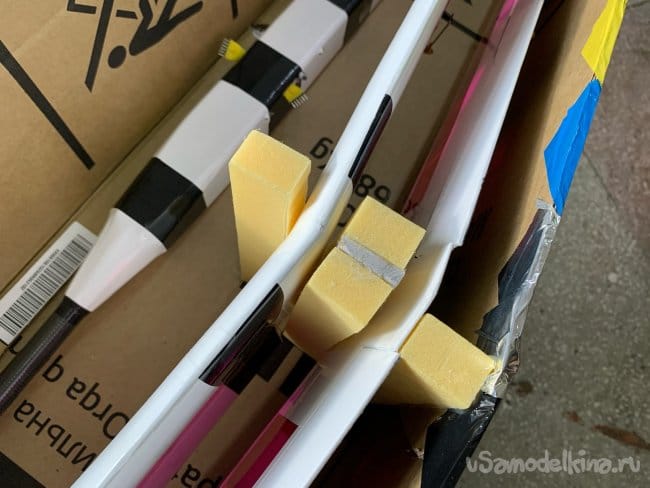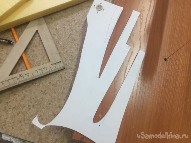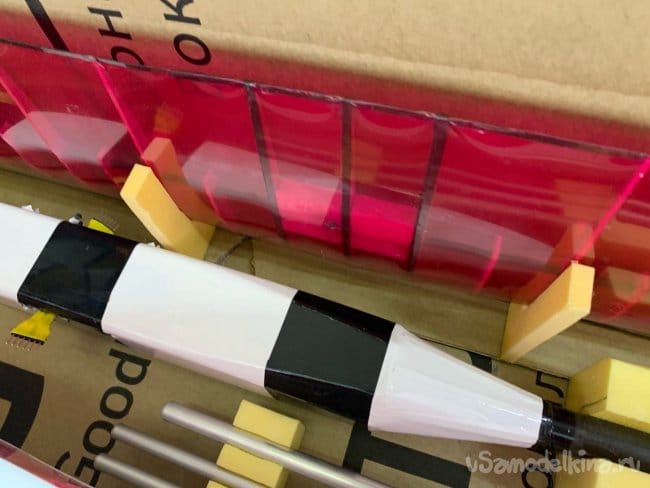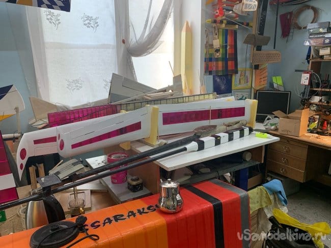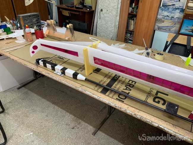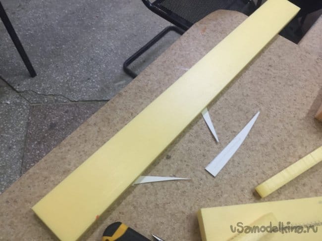 Подставки под крыло, чтобы оно не лежала на рулевых плоскостях, я изготовил из пенопласта вырезав их на терморезаке по заранее сделанным шаблонам профиля.