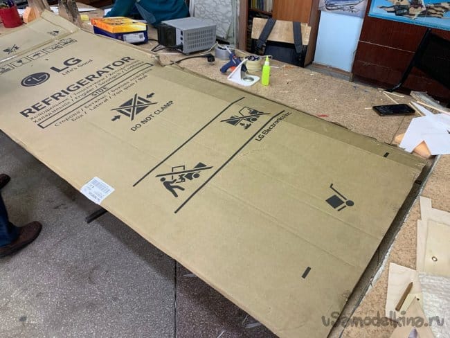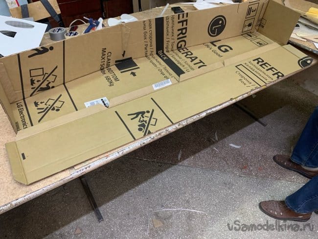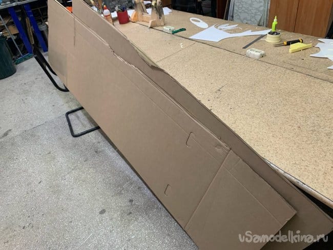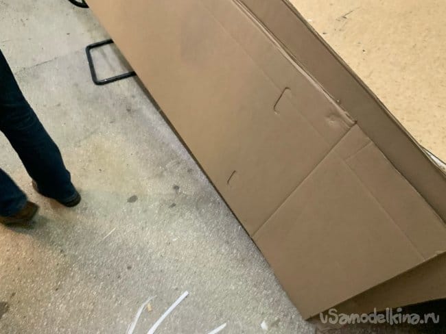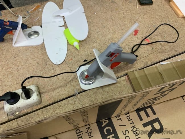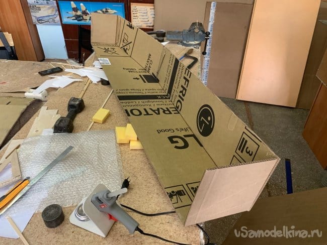 Так как ушка крыла и центроплан у меня закреплены намертво коробка получается с небольшим углом. При помощи железного уголка и сильных рук продавливаем канавку в картоне для того, чтобы правильно его согнуть. Делаем клапаны и клеим всё на горячий клей.