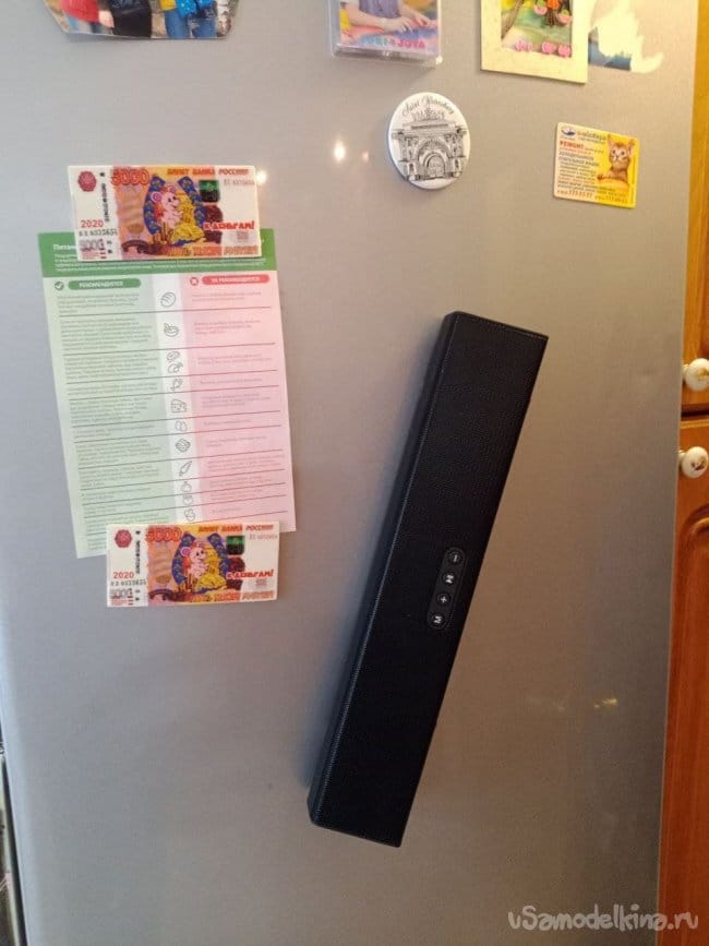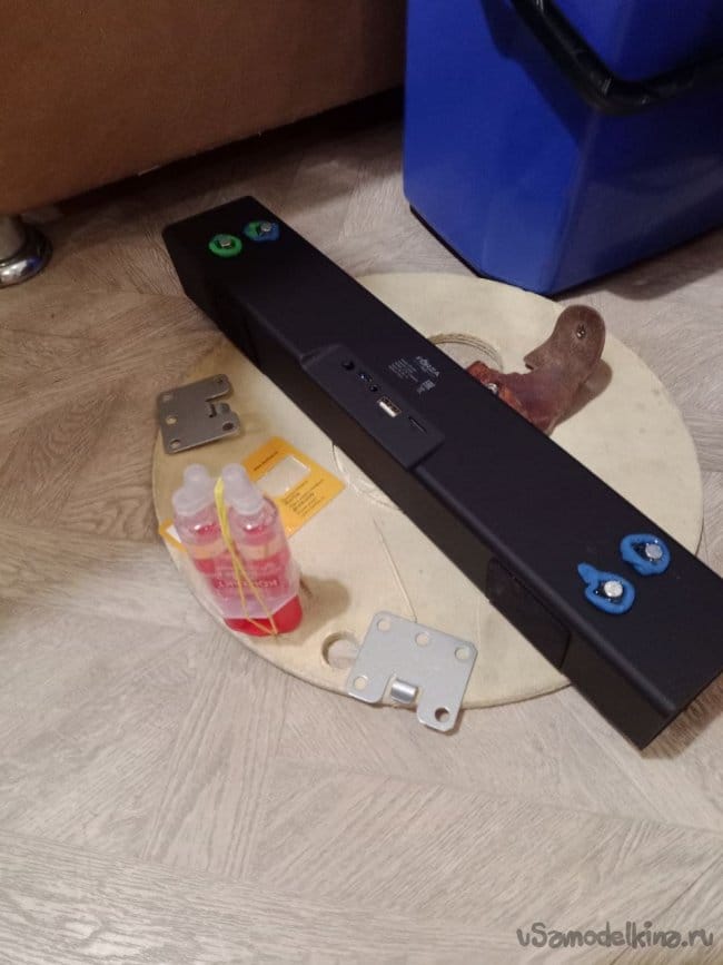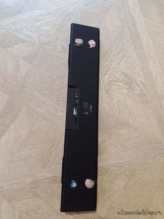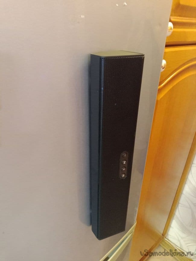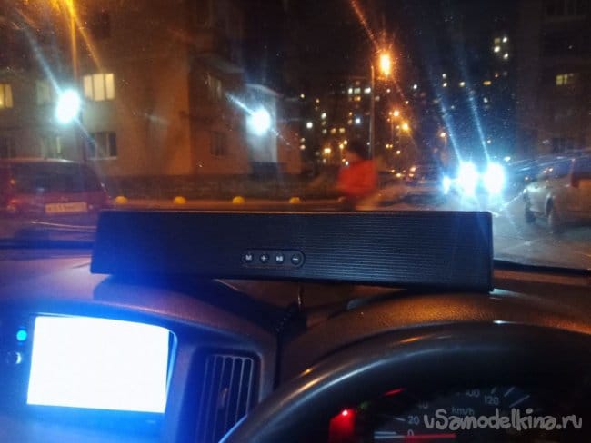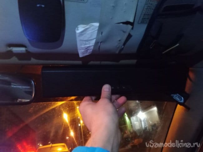 – самая важная составляющая часть проекта. Она должна быть громкой (у моей громкость оказалась избыточной), с солидным АКБ и прямоугольной формы для простоты крепления в машине. С чёрным цветом мне тоже повезло. Кроме того, я попытаюсь её сделать легко- и быстросъёмной, чтобы использовать дома в качестве той же громкой связи и облегчить процесс зарядки. Строго говоря, это даже не колонка, а САУНД-БАР, как следует из надписи на упаковке.Шаг 2. Примерка в автомобиле и