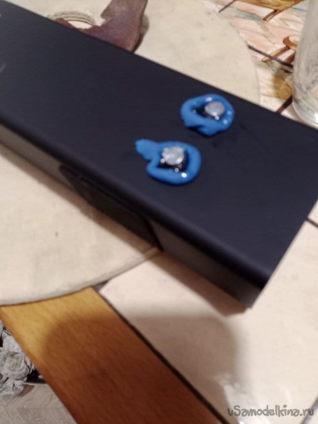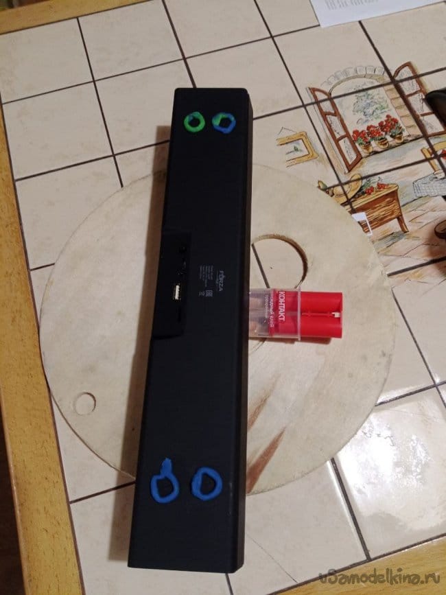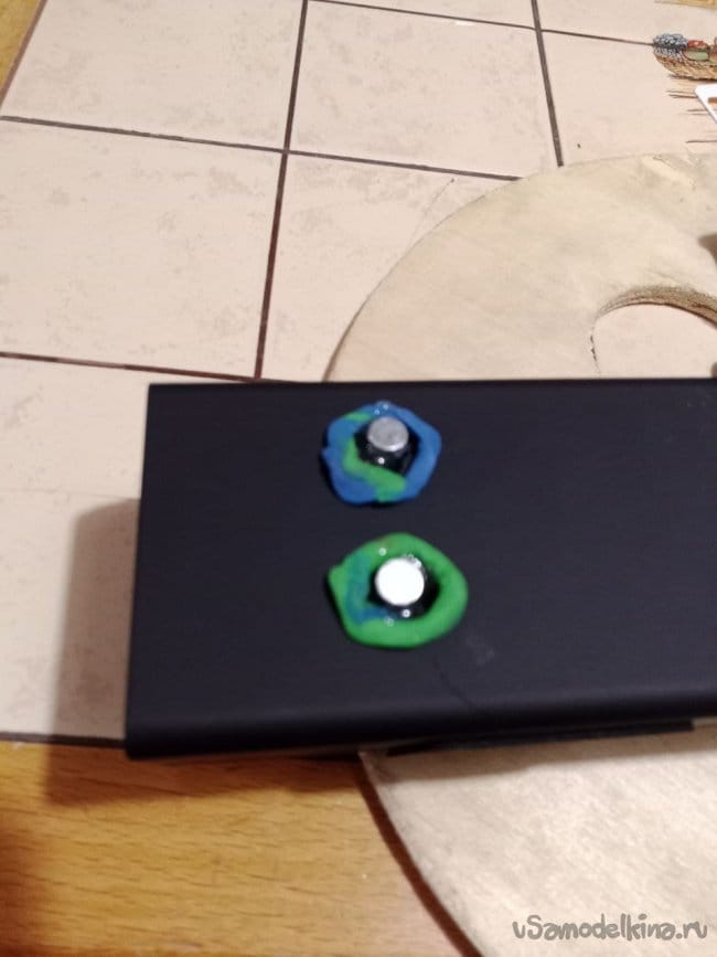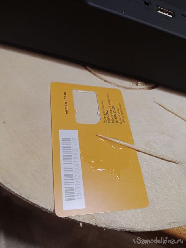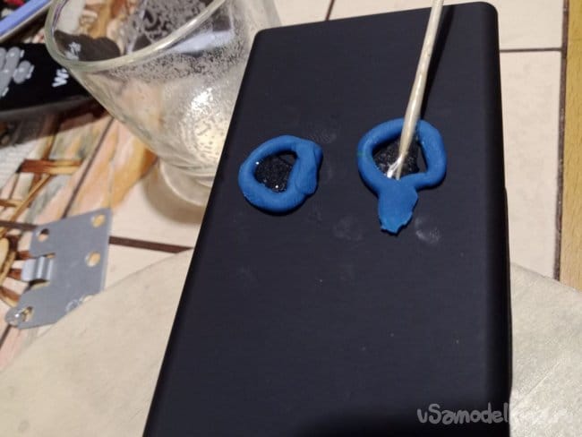 . Выбираем места их приклейки на колонку исходя из размеров железных пластин. Обезжириваем места приклейки. На симкарте разбавляем эпоксидку и перемешиваем её зубочисткой.Шаг 4. Из пластилина делаем колбаски, из них сворачиваем обрешётку, чтобы клей не вытекал, а его слой был бы большим, чтоб магниты не выпадали. Я решил, что 4 штуки хватит, скоро узнаем. Сим-карту с зубочисткой не выбрасываем, это будет индикатор степени высыхания. Магниты погружаем в клей, выравниваем их и колонку, чтобы клей равномерно распределился. Идём спать, утром должно высохнуть.