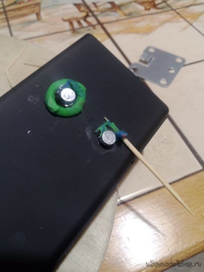 Шаг 5. Удаляем зубочисткой пластилин вокруг магнитов.