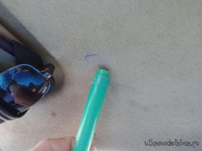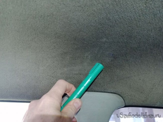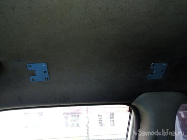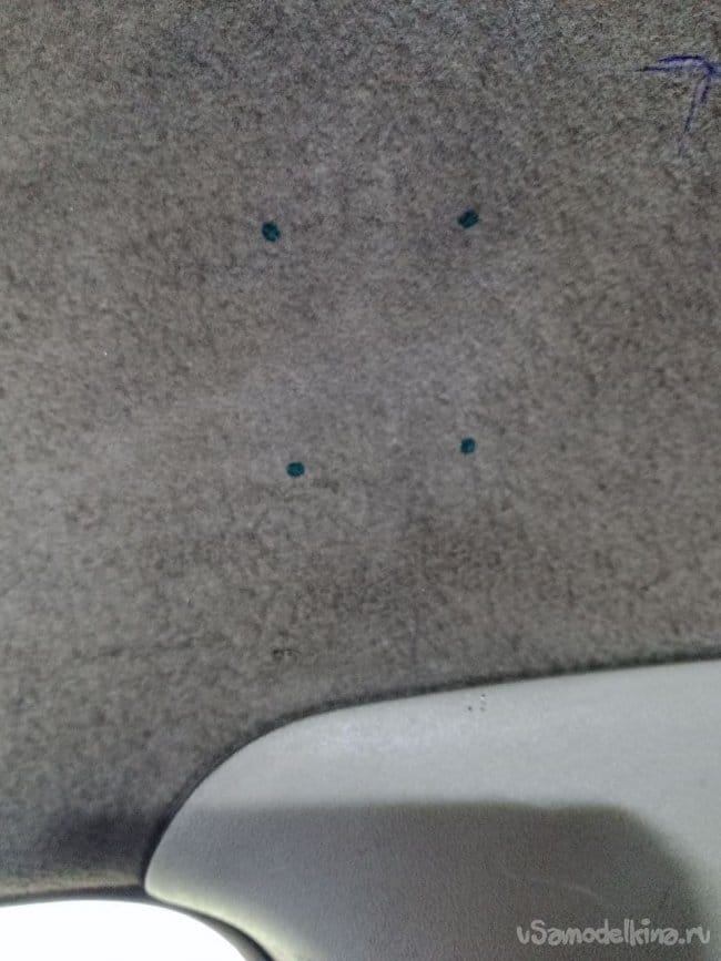 в машину. Сначала размечаем углы колонки ручкой. Работать тесно, фотки уж как вышли. Намечаем маркером места отверстий под саморезы. И вкручиваем их в обшивку. Мои железки оказались с выступами, они пришлись как нельзя кстати, с ними надёжнее. Для этих выступов пришлось ножом сделать надрезы в обшивке. Не знаю, что там внутри, но саморезы входят как в масло, посмотрим, как оно будет жить дальше.Шаг 8.