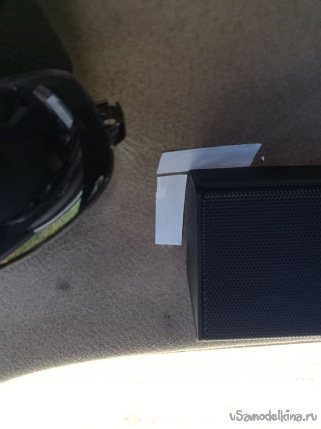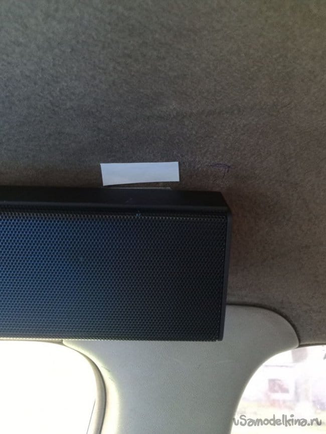 на место. Встал как родной! Теперь едем тестируем на скорости и в поворотах. Минут через 10 гонок по ухабам колонка заняла своё комфортное место, я его пометил изолентой, чтобы сразу вешать как надо.Всё, самоделка готова, колонка быстро и надёжно ставится/снимается, вечером дома будет работать Хэндс Фри Устройством Громкой Связи для жены, пусть еду готовит и одновременно по телефону говорит.