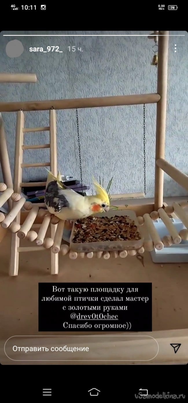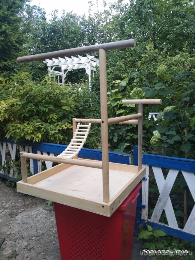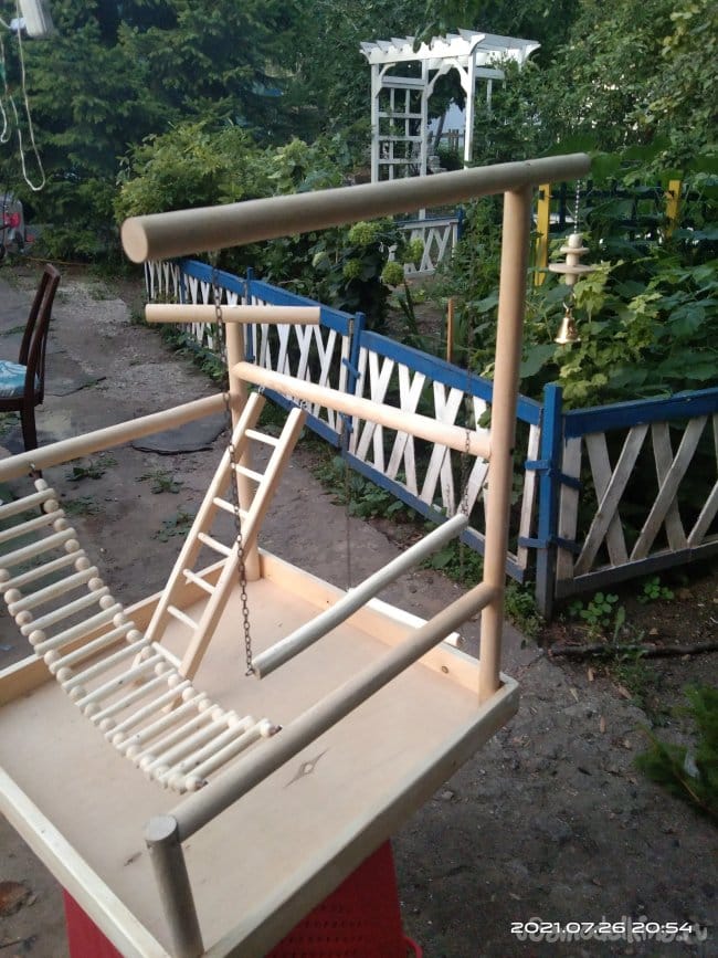 Заключительный этап - полная обработка всего комплекса от сколов дерева, заусенций и т.д. Это необходимо чтобы птица не поранилась. Шляпки саморезов были спрятаны под декоративные накладки. Конструкция ни чем не покрывалась, т.к. это может навредить питомцу. Если очень хочется, то можно немного обжечь и все зашкурить, но в моем случае в этом не было необходимости. По рассказам хозяйки кореллы, птица сначала настороженно отнеслась к площадке, но некоторое время все таки начала ее активно осваивать.