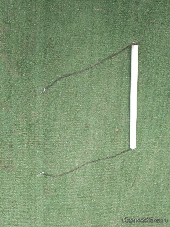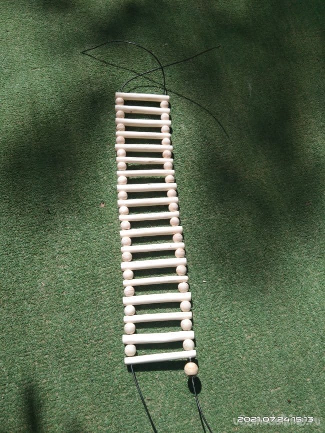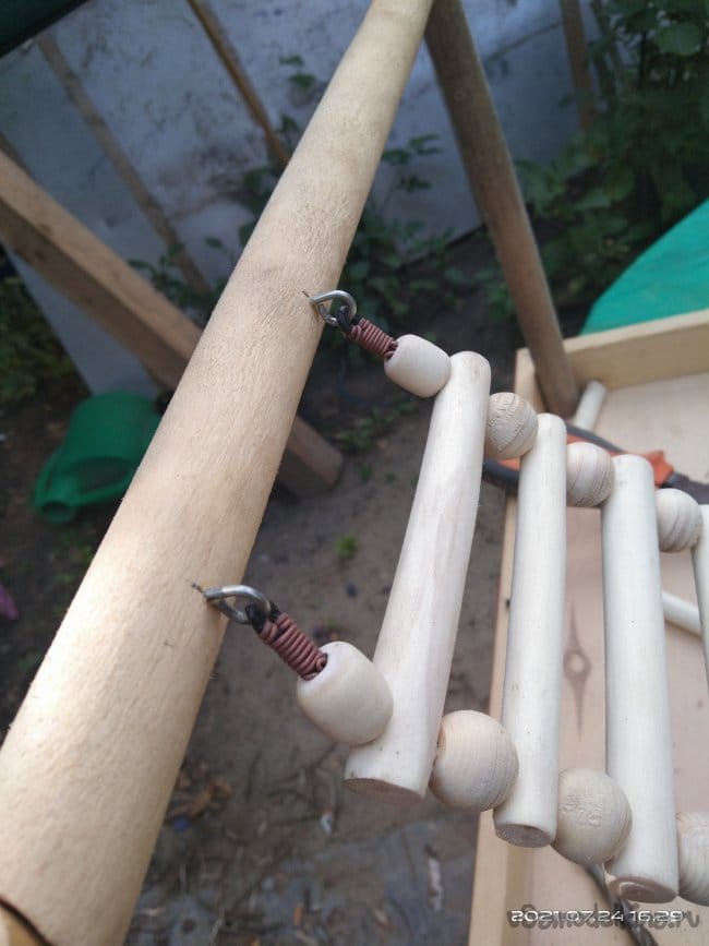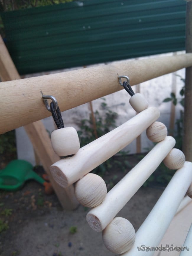 Изготовив основные детали площадки, приступил к изготовлению подвесных частей, которые будут располагаться внутри площадки и крепиться к перекладинам. Сначала сделал гибкую лестницу. Работа кропотливая и нудная, поэтому в процессе работы я совершенно забыл зафиксировать весь процесс изготовления на фото. Постараюсь подробно описать что я делал. С помощью набора свёрл для изготовления бусин, которые я ранее заказывал на Али, выточил необходимое мне количество бусин. Затем был долгий процесс их шлифования от заусенций, которые образовались в процессе высверливания. Сверла тут ни при чем, с работой справились на ура, просто древесина слишком мягкая была. Шлифовал с помощью шуруповерта. Зажав в патроне гвоздь, немногим более диаметра отверстия на бусинах, насаживал их на него и наждачкой убирал все неровности. Далее были изготовлены перекладины для лестницы, на каждой из которой с двух концов высверлены сквозные отверстия. В отверстия провел радио-кабель, внутри которого несколько металлических жил. Он очень прочный и скорее попугай обгрызет деревянные части чем испортит его! Для установки лестницы между перекладин были сделаны закругленные крючки, которые очень плотно вставлялись в высверленные для них отверстия. В случае нужды их тоже можно будет извлечь, правда приложив некоторое усилие. В эти крючки провел концы кабеля, а после этого спрятал их в самой лестнице, повторно вставив в отверстия. Чтобы они не выскользнули из отверстий, плотно обмотал их жилками от интернет-кабеля. Так же сделал и подвесные качели. В черенках высверлил отверстия, вставил в них крючки. Качели подвесил на цепь от старых часов с боем. В сборке обычной лесенки ничего примечательного нет. В боковых частях высверлил не сквозные отверстия в которые вклеил перекладины. И так же крючками прикрепил к перекладине. Отличие состоит только в том, что эту лесенку можно убрать в любой момент, т.к. она легко снимается с крючков.