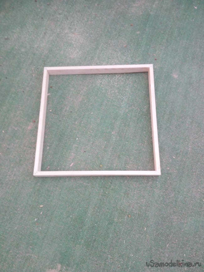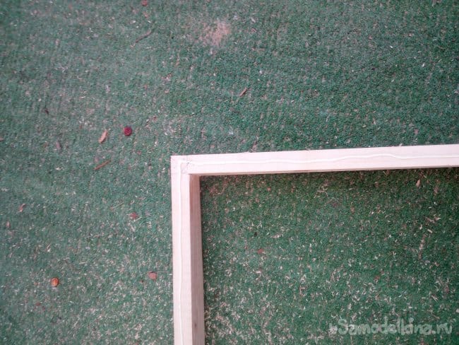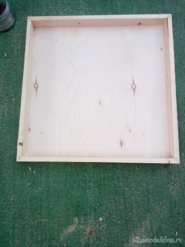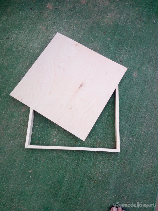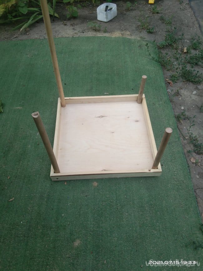 Для начала из реек был сделан ограничительный бортик для игровой зоны. Попугай -птица очень активная и с его помощью мусор после его разрушительных игр будет хоть немного задерживаться в основании площадки, а не разлетаться по всей комнате. Столярной лентой замотал рейки между собой. Торцовочной пилой задал угол в 45° на каждом торце заготовки. Нанес на углы столярный клей, крепко прижал заготовки друг к другу и с помощью строительного степлера, скобами, более прочно зафиксировал заготовки по краям, не давая им разойтись и нарушить геометрию квадрата. Затем, расчертив на фанере нужные мне размеры, стал делать дно для этих бортиков. Пилил электрическим лобзиком. Чтобы пропил вышел ровным, из небольшого бруска изготовил направляющую для лобзика. Иначе, как ни старайся, все равно хорошего ровного реза не получится. От разметочной линии заготовки отступил 3,7 мм — это расстояние от пилки лобзика до края платформы в моем случае. Закрепил направляющую саморезами и начал пилить. Полотно использовал для фигурного реза. Оно при работе не рвет дерево с внутренней стороны. Далее, после того как бортик подсох, так же промазал клеем рейки по всему периметру. Приложил фанеру, закрепив ее финишными гвоздями по углам. Далее, высверливал отверстия в фанере и бортиках под саморезы, раззенковывая их чтобы спрятать шляпки крепежей. Стягивал без фанатизма, чтобы не расколоть рейки бортика.