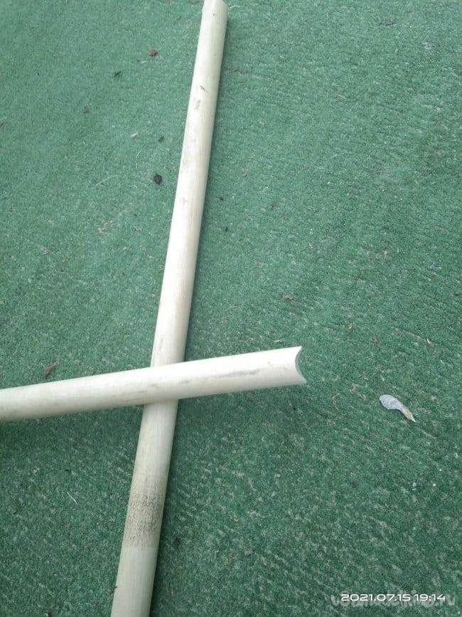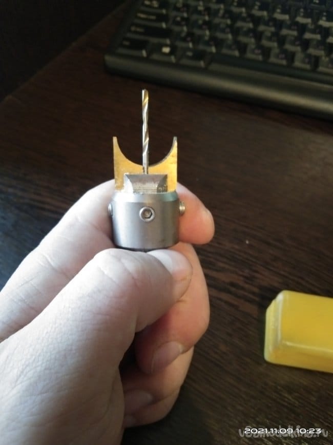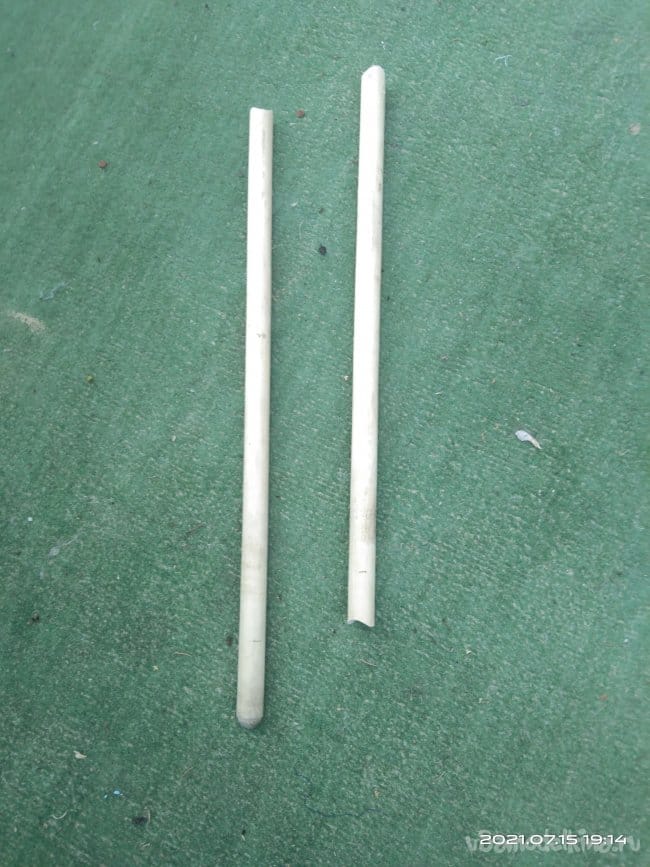 Из имеющихся у меня черенков начал делать вертикальные опоры под перекладины, к которым будут крепиться все остальные детали игрового стенда. Чтобы обеспечить плотное примыкание цилиндрических опор к углам поддона, необходимо придать нижним частям опор более плоскую форму. Отметив на заготовке где кончается бортик, на этом уровне сделал два небольших пропила и убрал стамеской лишнее. Затем, определившись на каких опорах, в верхних их частях, будут установлены перекладины, выточил закругленные выемки. Все вот эти манипуляции необходимы для того, чтобы все детали как можно плотнее и прочнее были закреплены между собой, т.к. площадка должна быть очень устойчивой, питомец ведь будет не маленькой птичкой. Для того чтобы сделать эти выемки, пазы, называйте как угодно, пришлось смастерить для этих целей специальную насадку на дрель, т.к. ничего подходящего у меня не нашлось. Взяв небольшой отрезок черенка, из которого и изготавливаются все опоры, я высверлил в нем сквозное отверстие. Затем по всей длине сделал неглубокий пропил. В отверстие поместил шпильку, зафиксировав ее с двух сторон гайками. С одной стороны шпилька должна быть длиннее, чтобы можно было зажать насадку в патрон дрели. Нарезал наждачную бумагу, обернул ее вокруг девайса и вставил концы в прорезь на болванке. Чтобы наждачка не слетала, зафиксировал бумагу в прорези деревянным клином. Установил насадку на дрель и упирая в нее конец заготовки получил нужную мне выемку, как раз под необходимый мне размер. Такие действия я произвел со всеми заготовками, где были нужны пазы. Насадка получилась удобной, несмотря на то, что из-за неровно высверленного центрального отверстия, при работе было небольшое биение. Но тем не менее, она позволила мне существенно ускорить процесс. Детали крепил саморезами, так что при необходимости всю площадку можно будет легко разобрать и убрав части в поддон, так как он не разборный, с легкость либо перевезти, либо вообще убрать.