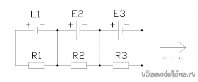 Рис. 4. Эквивалентная схема каскадного включения ряда БП в электролизере.
