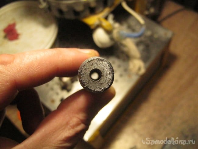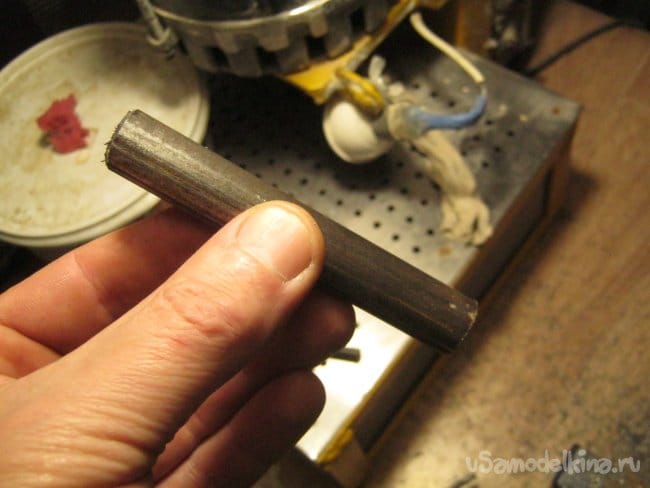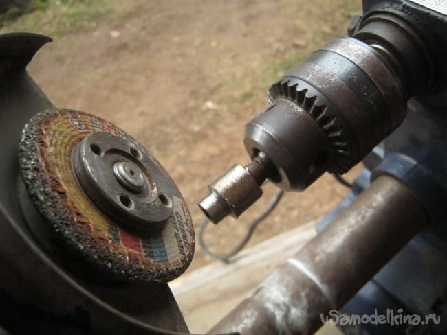 Сделал вращающимся зачистным (толстым) абразивным диском маленькой (круг Ø125 мм) УШМ. По вращающейся в сверлильном станке (~3000 об/мин) детали (Фото 8).