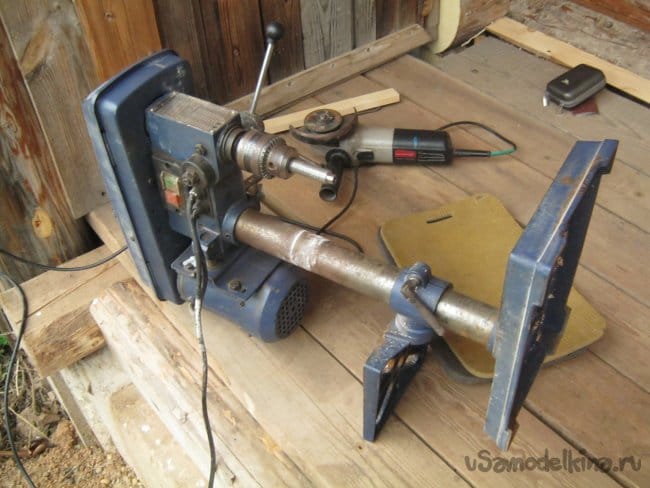 Здесь, для вращения детали применил настольный сверлильный станок, но приспособить можно то, что есть под рукой вращающегося – электродрель, перфоратор, шуруповерт, токарный станок по дереву, электроточило и т. п. Свою вертикальную сверлилку положил на бок, в штатный патрон заготовка впритык, но влезла, что очень облегчило дело. Сверло зажал в аналогичном свободном сверлильном трехкулачковом патроне. Во время сверления удерживал его рукой (Фото 4, 5).