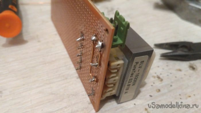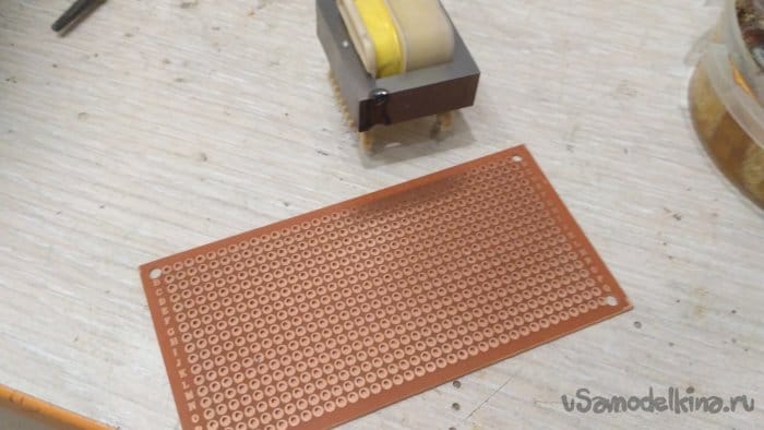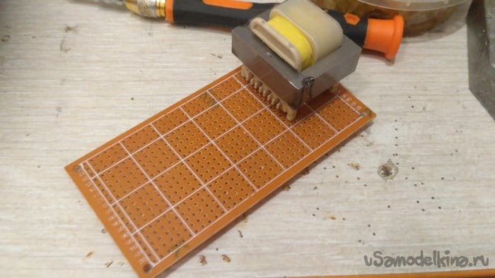 Припаиваем трансформатор, предварительно залудив все выводы и при необходимости рассверлив заводские отверстия на плате. Не жалеем припоя, в этом месте необходимо максимально качественное соединение.