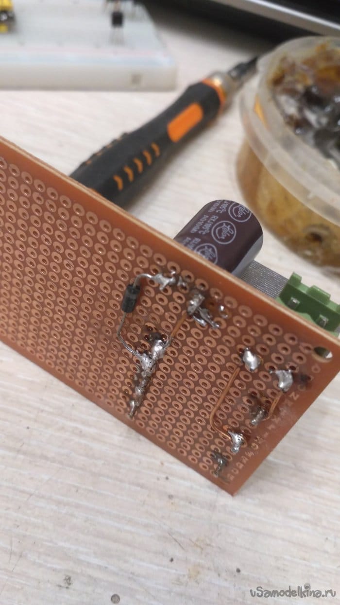 Припаиваем выходную клемму на условные 12 В. От неё идут два провода: отрицательная и положительная шины, которые попутно подсоединяется к двум стабилизаторам на 5 и 8 В.