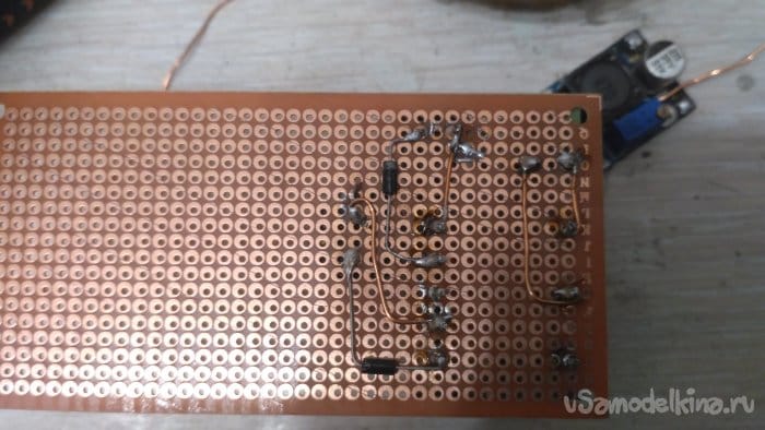 Все соединения деталей выполняем проволокой. И на этом этапе снова проверка. На каждом из конденсаторов должно быть напряжение больше, чем на соответствующих им обмотках изначально.