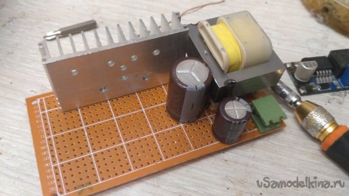 На радиатор ставим стабилизатор LM317. Подключаем к нему питание от выхода на примерно 30 В. Припаиваем ещё один стабилизатор, L7805, к выходу примерно 15 В. Его тоже ставим на небольшой радиатор. Не забываем проверить работоспособность пятивольтового выхода.