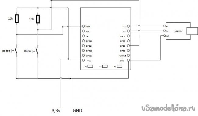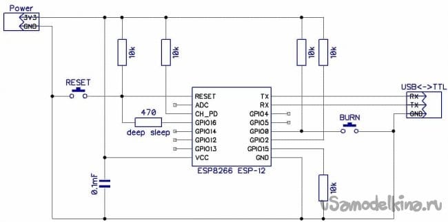 В общем, работать с ESP12 несмотря на описанные ранее недостатки, мне понравилось. При цене около 80 р./шт. - весьма достойная замена Ардуинке, планирую использовать их в дальнейших своих поделках. Уже заказал десяток…. Правда паять их в дальнейшем планирую не на китайский переходник, а на самодельные платы. Дело в том, что более правильная схема обвязки модуля ESP-12 (и подобных) выглядит так: