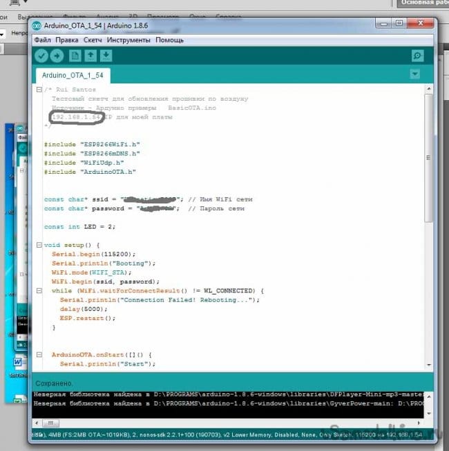 2. При наличии нескольких активных модулей есть вероятность загрузить новый скетч не в тот модуль. (Поэтому IPадрес моего, конкретного модуля я записал в шапку скетча, рекомендую изменить его на ваш, актуальный)
