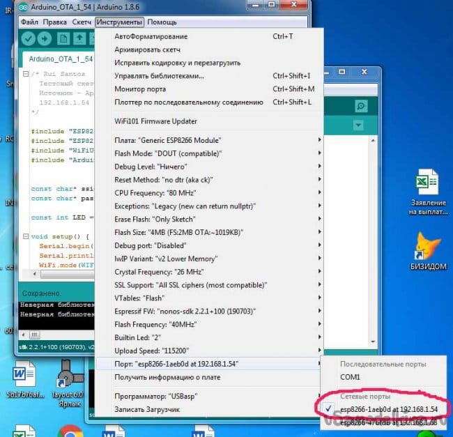 Теперь модуль можно отключить от компьютера, и заливать в него новый скетч по воздуху, выбрав для того виртуальный порт ESP8266 – 19a4b5 at192.182.1.38 (Никакие кнопки нажимать уже не нужно).