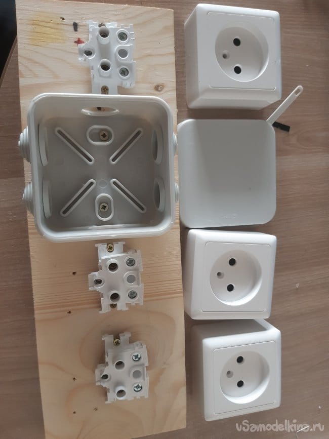 Закрепил распределительную коробку вместе с розетками на подходящем кусочке фанеры.