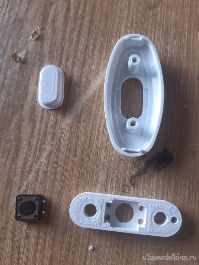 Удалены внутренности, внутрь интегрирована тактовая кнопка 12х12мм., светодиод и токоограничивающий резистор на 330ом. Вкладыш и новый толкатель были напечатаны на 3д принтере. Вот архив с модельками