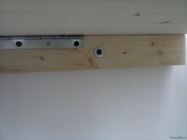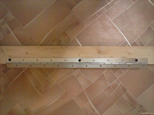Далее закрепляем мебельный щит к петле рояльного типа. Здесь возможно понадобиться дополнительная пара рук. Для наглядности на фото показано при крепление при снятом со стены бруске.