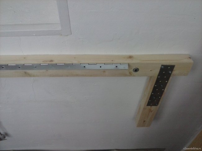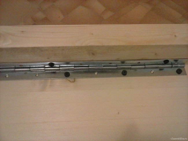 Закрепляем петлю рояльного типа к бруску 80 см с помощью саморезов.