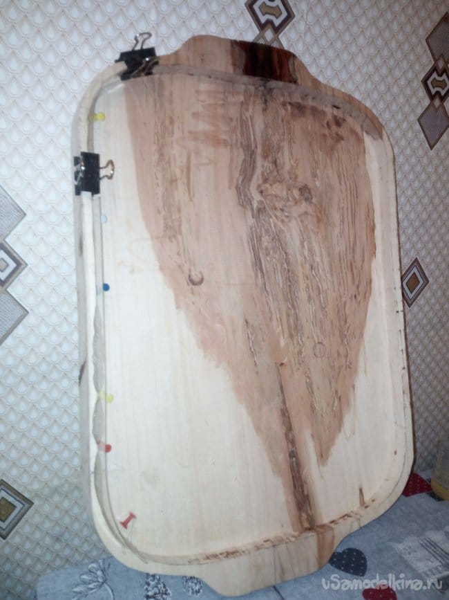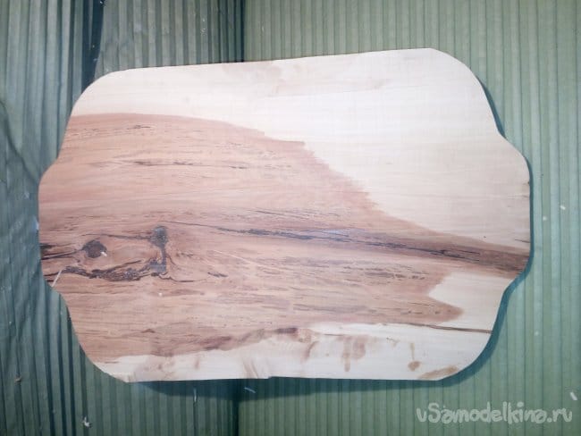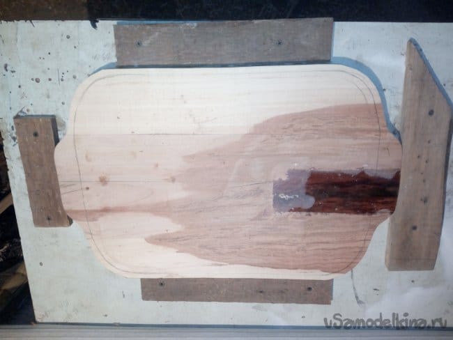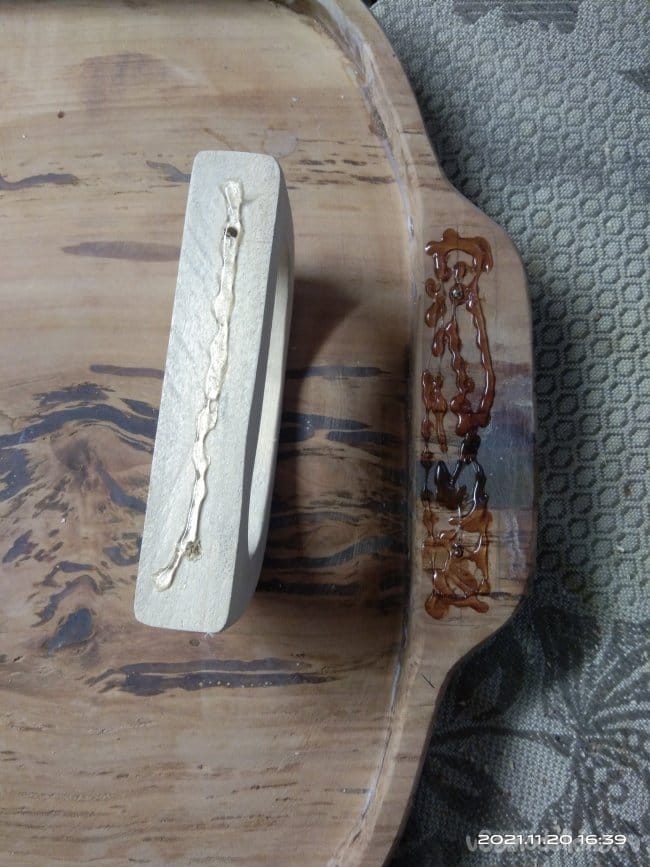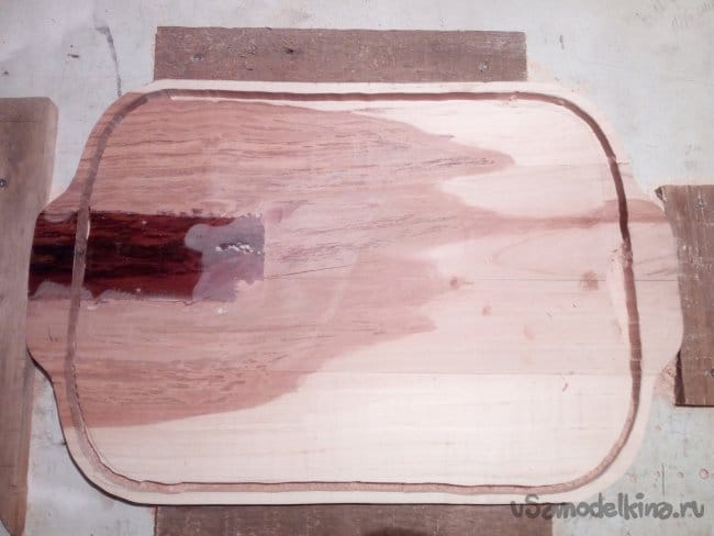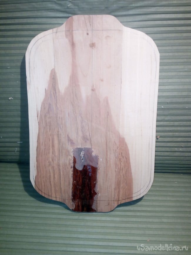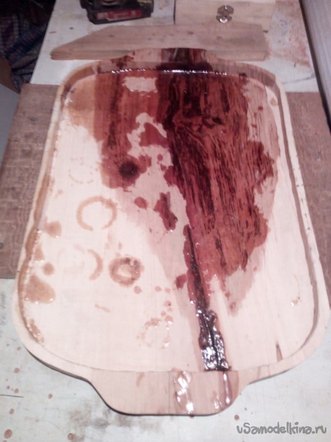 Для того чтобы укрепить древесину и скрыть все эти изъяны, решил использовать эпоксидную смолу. Тонким оргстеклом прикрыл все места где смола могла вытечь и клеевым пистолетом проклеил швы. Он хорош тем, что клеевой состав быстро сохнет и в отличие от герметика, которому для полного застывания требуется от нескольких часов, до суток, работу можно продолжать буквально минут через 5-10. Смешав смолу с отвердителем, аккуратно залил ее во все ходы и отверстия. Затем оставил заготовку сохнуть. На это ушло несколько дней. Затем, на бумаге нарисовал шаблон, форму для будущего подноса и перенес ее на деревянную основу. Электролобзиком вырезал по нарисованному контуру.