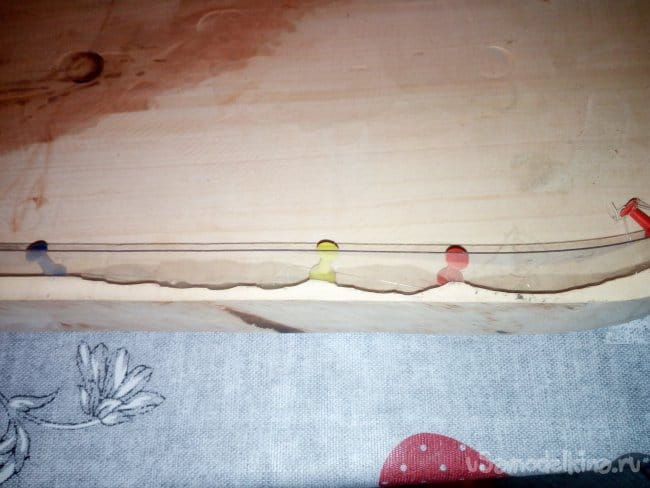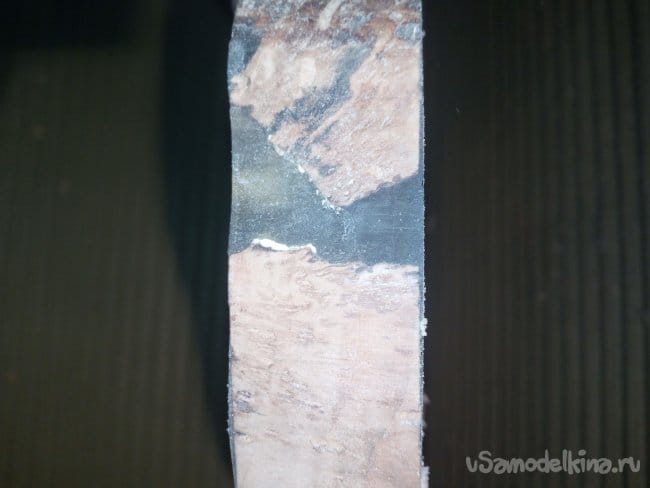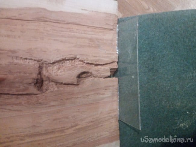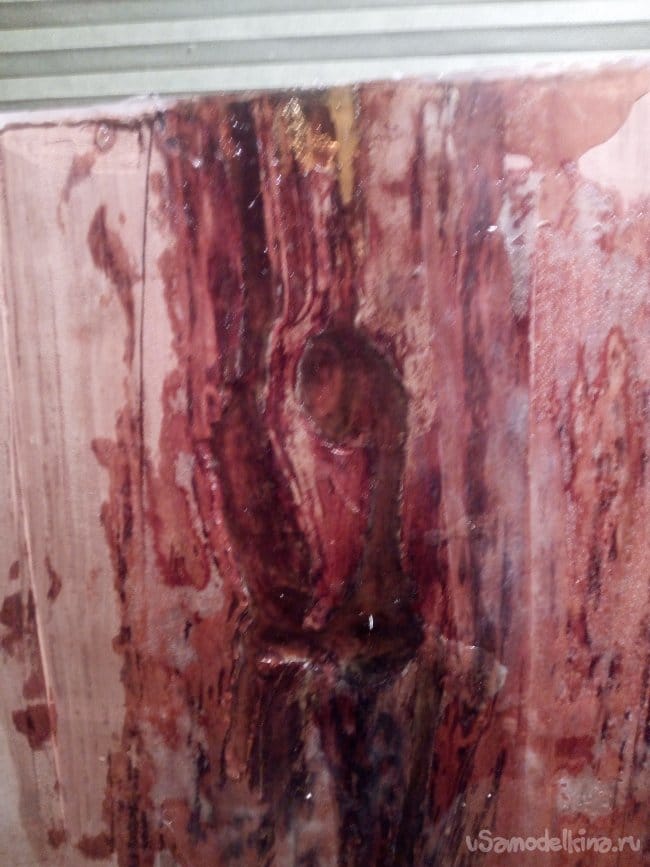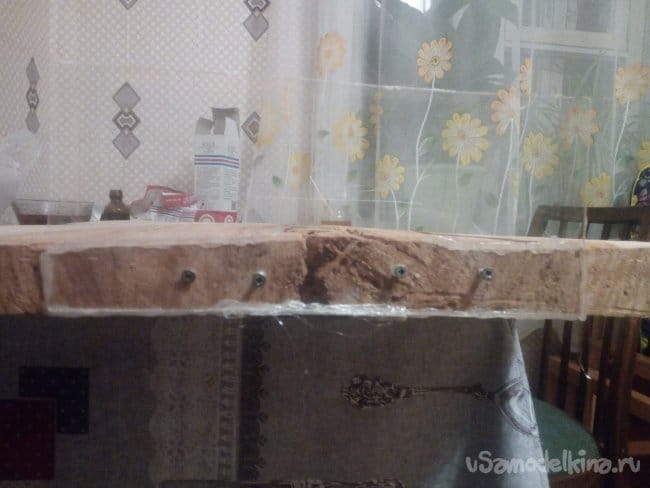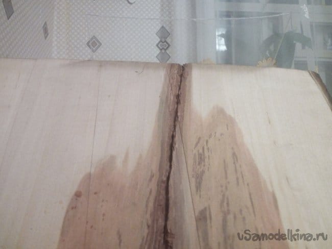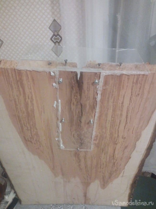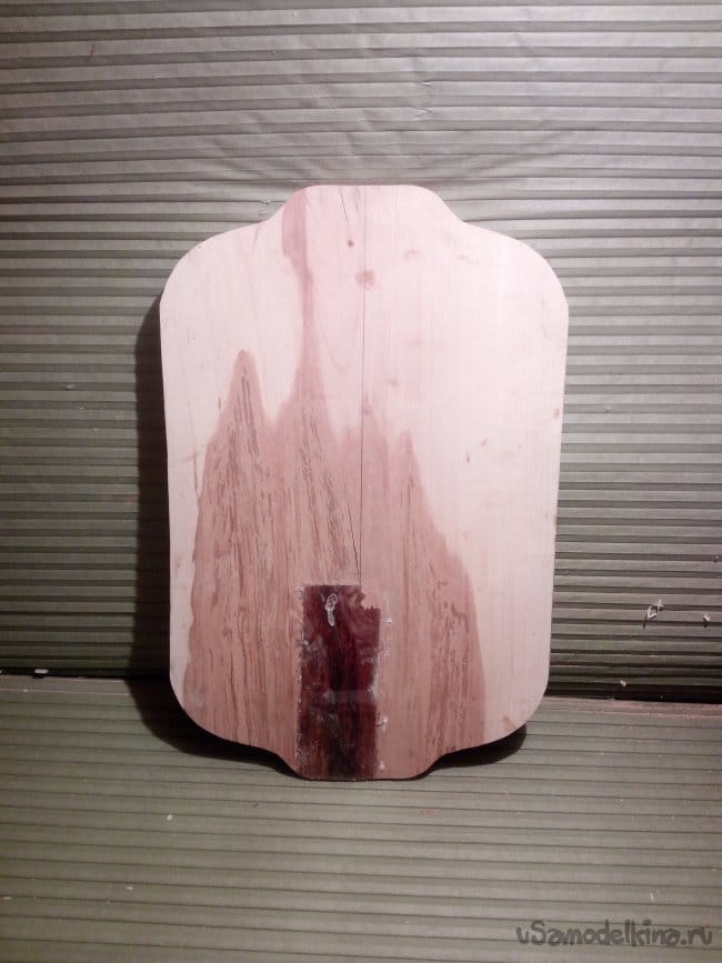 Для того чтобы укрепить древесину и скрыть все эти изъяны, решил использовать эпоксидную смолу. Тонким оргстеклом прикрыл все места где смола могла вытечь и клеевым пистолетом проклеил швы. Он хорош тем, что клеевой состав быстро сохнет и в отличие от герметика, которому для полного застывания требуется от нескольких часов, до суток, работу можно продолжать буквально минут через 5-10. Смешав смолу с отвердителем, аккуратно залил ее во все ходы и отверстия. Затем оставил заготовку сохнуть. На это ушло несколько дней. Затем, на бумаге нарисовал шаблон, форму для будущего подноса и перенес ее на деревянную основу. Электролобзиком вырезал по нарисованному контуру.