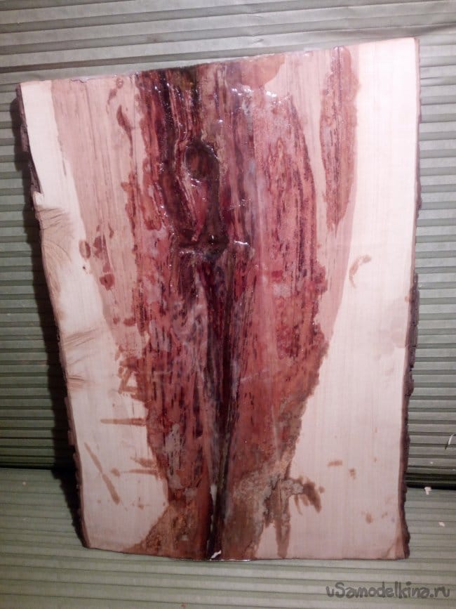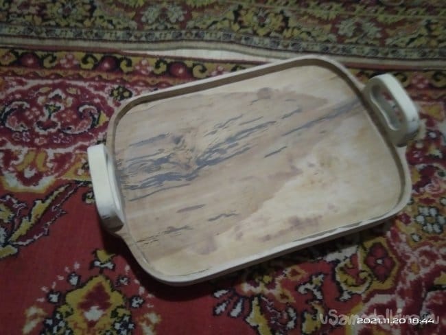 Чтобы поднос был более насыщенного цвета, а так же чтобы исключить его порчу от влаги, нанес на него льняное масло. Ветошью тщательно намазал все поверхности, потом излишки убрал сухой тряпкой. На удивление все быстро высохло. Может это из-за того, что древесина была очень сухой и пористой, а может и температура помещения в которой он сушился была подходящей. Но, так или иначе, через несколько дней поднос уже не пачкал руки маслом, не оставлял следов на салфетке, которыми я проверял процесс сушки изделия. Единственное, я вытер масло с поверхностей, где была эпоксидная смола. И вот что получилось в конечном итоге. Конечно, этот проект далеко от идеала, но на основе сказанного, те, кто захочет сделать нечто подобное, сможет легко избежать повторения моих ошибок и у него получится намного лучше!