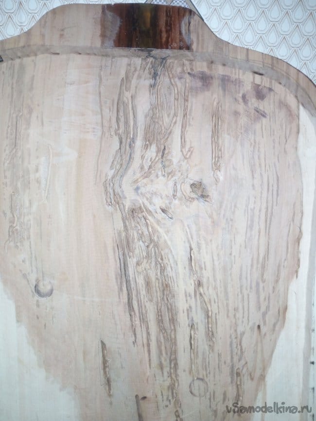 Топором и стамеской были убраны большие неровности, затем электрическим рубанком были выровнены плоскости с обеих сторон заготовки. Далее отрезал кусок, который по размерам должен был быть подносом. Ствол внутри был немного подпорчен. Были проложены какие-то трухлявые ходы насекомыми древоточцами. Поэтому пришлось решать и эту проблему. Щеткой с металлической щетиной тщательно выскреб всю отмершую древесину. Затем на дрель установил круглую насадку, так же с металлической щетиной и начал дальнейшую обработку. Изначально ставил насадку на шуруповерт, им удобнее работать в плане мобильности, он не ограничен шнуром. Но его мощности и скорости не хватало для полноценной обработки поверхности заготовки. Поэтому начал использовать дрель. Благодаря быстрым оборотам и металлической щетине, все трухлявые, испорченные части были более-менее хорошо вычищены. Но при детальном осмотре поверхности я увидел, что эти ходы насекомых достаточно глубоки и не полностью вычищены даже после обработки их щеткой. Поэтому взяв дремель, или бор-машину, поставил насадку и с ее помощью уже более тщательно убрал все ненужное. Даже если бы я полностью обстругал поверхность, то она стала бы тонкой, что не очень хорошо для подноса. А в некоторых местах древесина была настолько трухлявой, что получились сквозные отверстия.