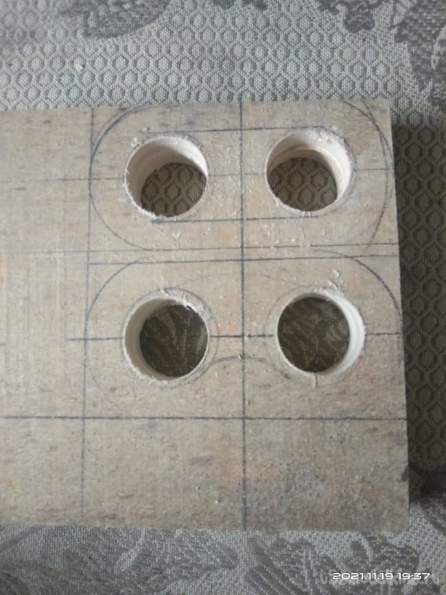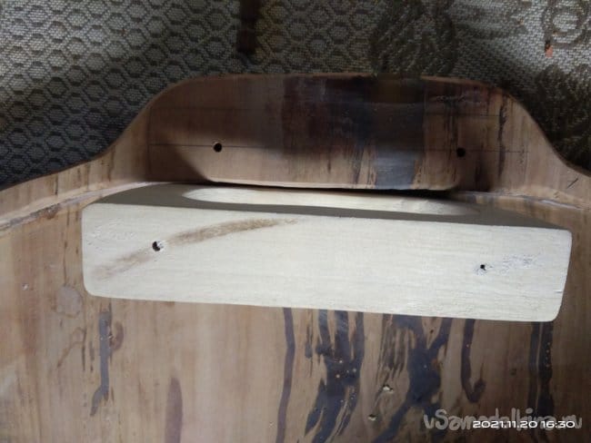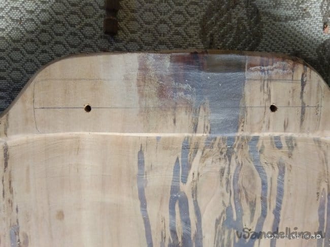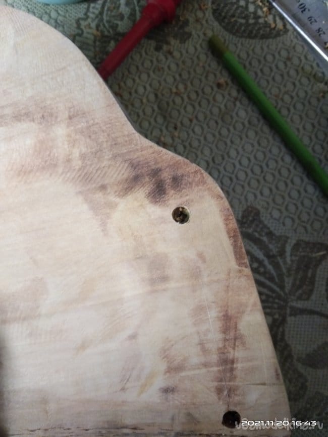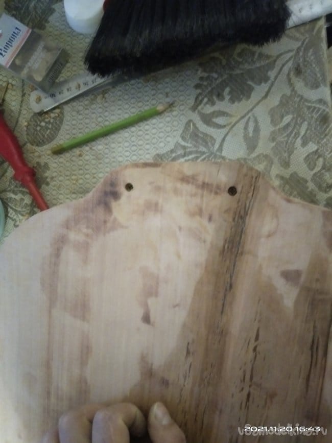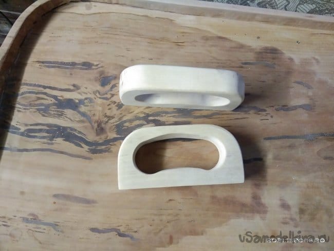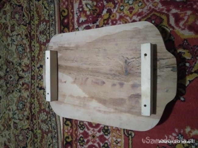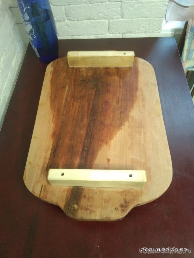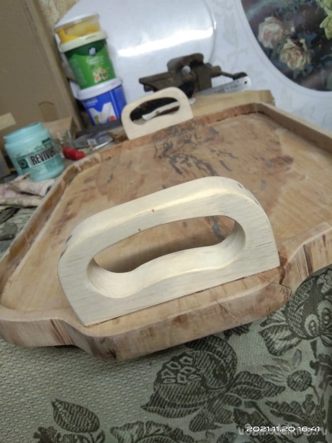 На этом этапе работ надобность в этой самоделке отпала. Поэтому года на полтора этот проект был забыт и лежал на полке в ожидании своего часа. Необходимость в нем возникла пару недель назад. Я его достал и начал дальше приводить в порядок. За то время, что он лежал, древесина немного потемнела, но это даже хорошо. Такой цвет мне больше понравился. Наждачной бумагой обработал края заготовки, его дно и ручки. Особое внимание уделил бортикам. Эпоксидку постарался посильнее "заматить", чтобы она не бросалась в глаза и выглядела более естественно, сливаясь с деревом. Хотя она и прозрачная и через нее видно дерево, все равно она заметно бросалась в глаза. Далее стал делать ручки. Изначально они не планировались. Я хотел в нижней части ручек сделать выемки, чтобы в них спокойно помещались пальцы. Но со временем концепция изменилась и чтобы не утоньшать древесину, тем более что на ручки и будет приходиться основная, пусть и не значительная, но все таки нагрузка, было принято решение сделать ручки накладными. Для них была использована уже древесина березы. Торцовочной пилой отпилил часть доски, чтобы в дальнейшем с ней было удобно работать. На заготовке нарисовал нужную мне форму. На сверлильный станок установил коронку по дереву и в несколько проходов высверлил отверстия. Далее лобзиком придал нужную форму, отпилив все не нужное. На этот же сверлильный станок установил насадку от дремель, с наждачной бумагою Ей я убрал все неровности и придал более закругленные формы ручкам. Далее работал наждачной шкуркой, придавая заготовкам более законченный вид. Затем разметил на подносе места их крепления и высверлил сквозные отверстия в поддоне для саморезов. Чтобы с их помощью ручки были надежно закреплены. Так же отверстия были сделаны и в нижних частях ручек, чтобы не расколоть их при закручивании саморезов. Хотя это вряд ли бы произошло. Древесина у березы достаточно прочная и вязкая. На обе заготовки нанес клей гель. Он хорош тем, что для его схватывания достаточно просто плотно прижать склеиваемые заготовки друг к другу. Решающее значение имеет сила нажатия, а не ее продолжительность. И что еще немаловажно, данный гель склеивает детали и при отрицательных температурах. Это особенно хорошо в тех случаях, если рабочее помещение не имеет отопления. Вкрутил саморезы и детали на мертво соединились между собой. Так же изготовил и небольшие ножки для поддона. Они тоже из березы. В отличие от ручек, ножки делал съемными. Так что в случае необходимости их можно легко снять и использовать поднос без них.