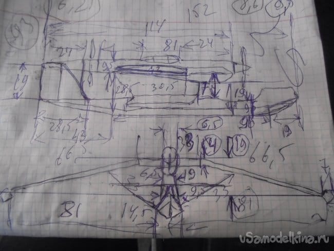 Поскольку на первом рисунке самолёт был показан во всех ракурсах, можно было сделать чертёжик модели. Что я и сделал.