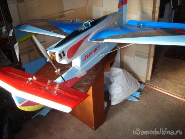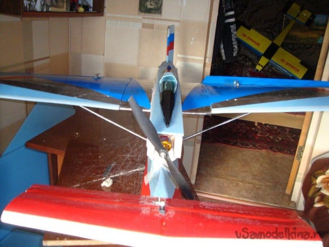 Обтянул крылья цветным скотчем, навесил элероны, установил сервомашинки, подсоединил тяги.
