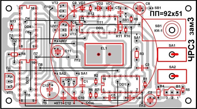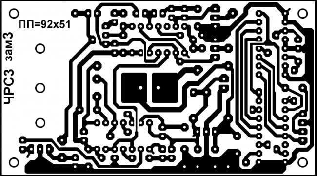 Печатная плата ЧРС3 выполнена из фольгированного стеклотекстолита размерами 92 х 51 х 2 мм (см. рисунок 2). Все резисторы (кроме R3, R4, R8 и R11) на плате устанавливаются вертикально. Диаметр отверстий на печатной плате под микросхемы и перемычки - 0,7 … 0,8 мм, под остальные радиоэлектронные компоненты – 0,8 … 1 мм, под соединительные проводники - 1…1,2 мм, под контакты EL1 - 1,5…1,6 мм.; под крепёжные отверстия – 3,2 мм.