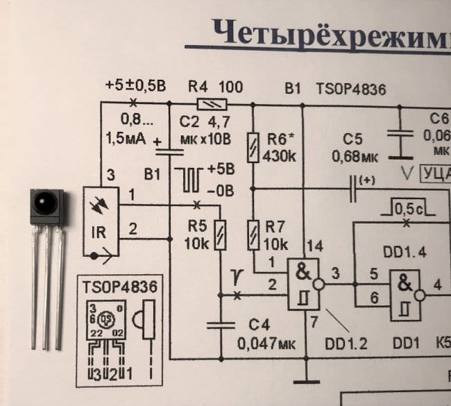 Самой важной деталью ЧРС3, пожалуй, является ИК-фотоприёмник B1 TSOP4836, изображённый в левой части рисунка 6. Конечно, его можно заменить аналогами (TSOP31236, TSOP4837), но если и аналогов нет в наличии, то схему ЧРС3 перед пайкой рекомендуется значительно упростить.