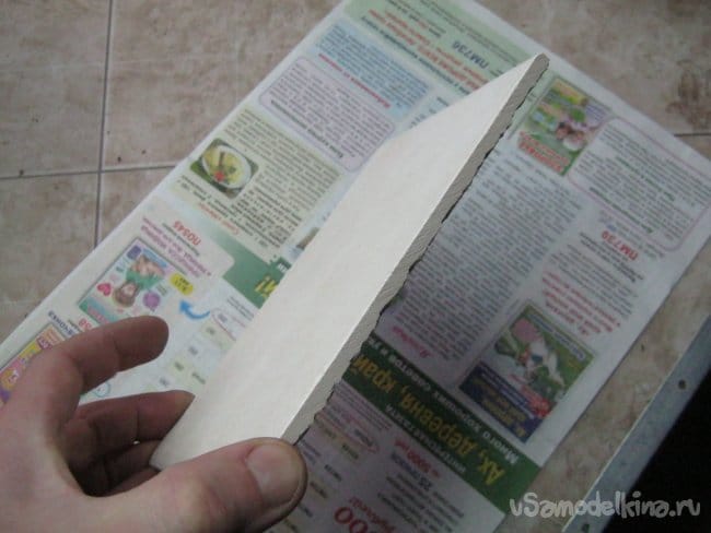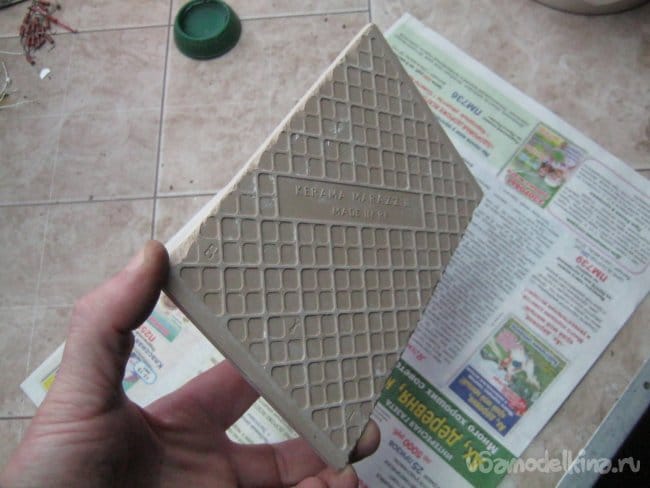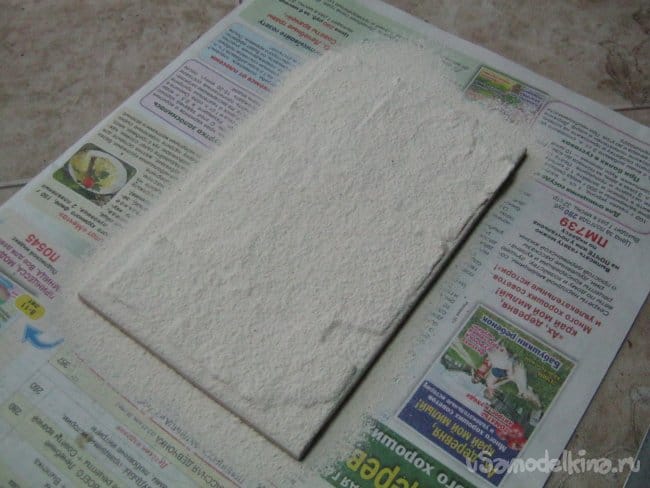 Фото 12. Подготовленное основание – керамическая плитка со слоем керамической же бумаги, через ситечко нетолсто присыпанная сухим гипсом.