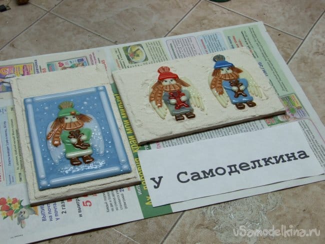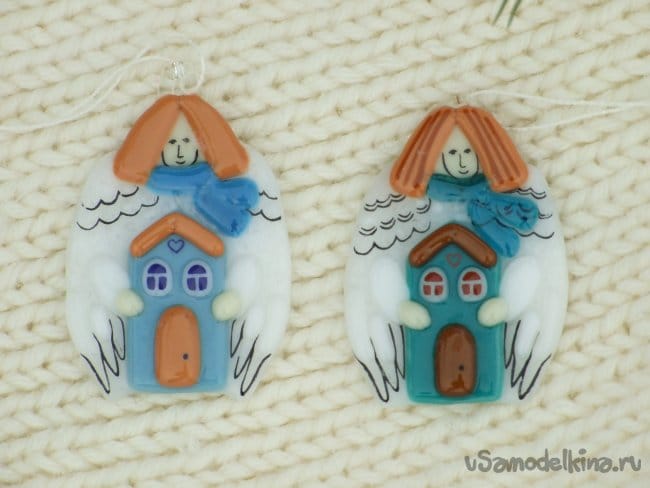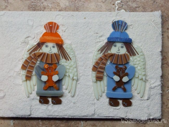 Фото 6. Вырезанные стеклорезом детали двух фигурок ангелов. В «помпонах» твердосплавным инструментом с водой просверлено по отверстию для веревочек.